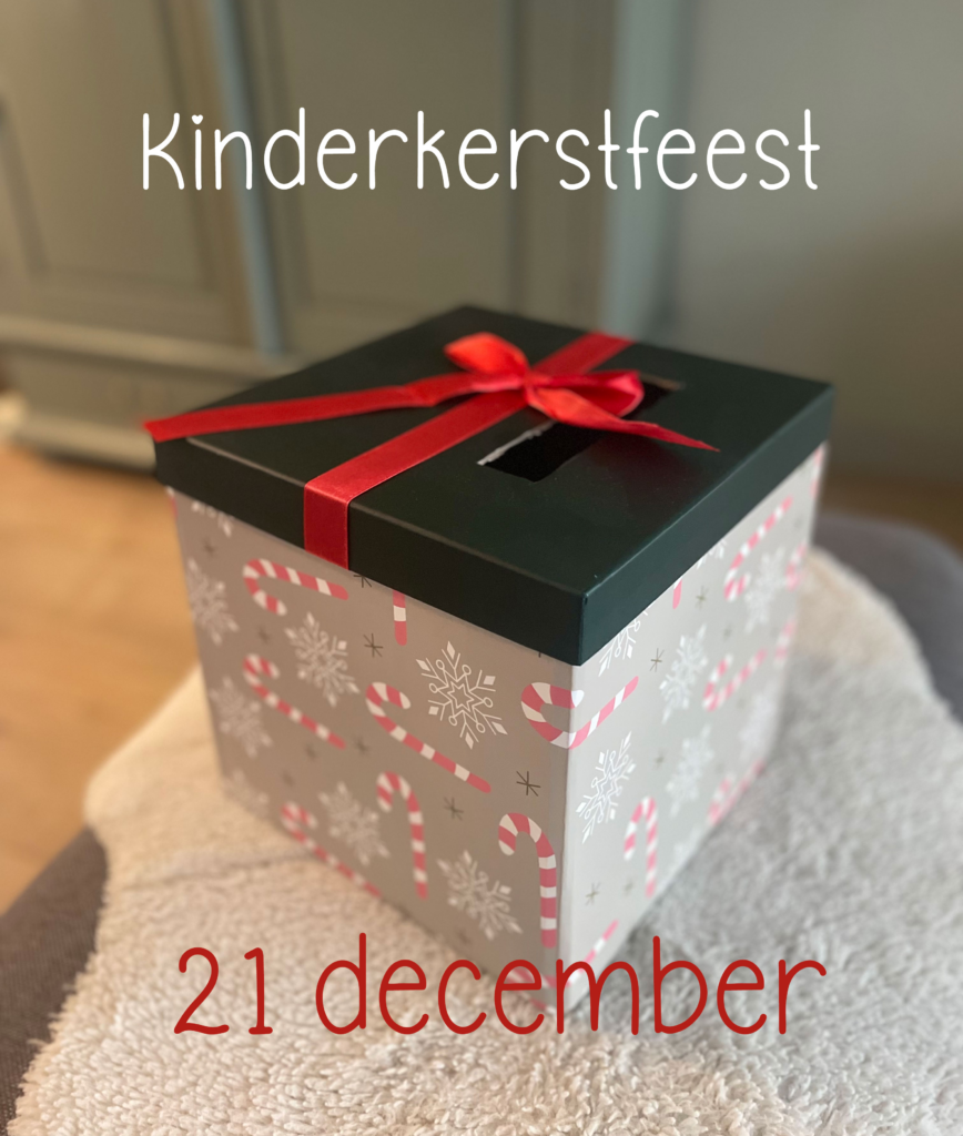 In plaats van de kerstcollecte aan de deur staat de komende zondagen deze cadeaudoos in de kerk waar u uw gift voor het kinderkerstfeest in kunt doen.